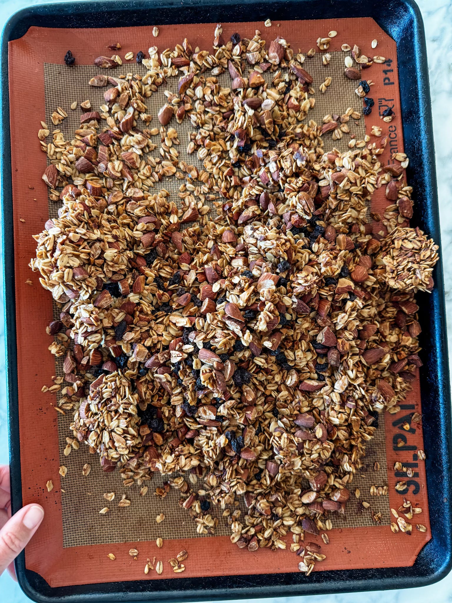 Remove the granola from the oven and sprinkle the currants on top. Let the granola cool completely and then store in an airtight container in the refrigerator.