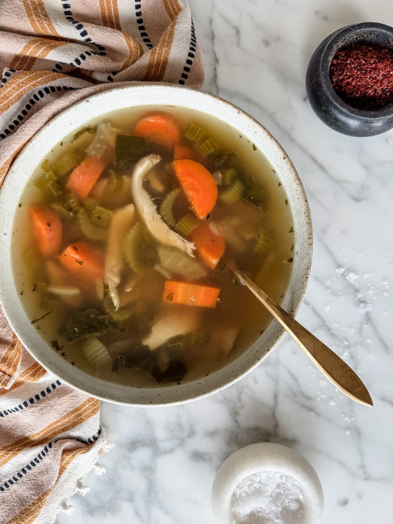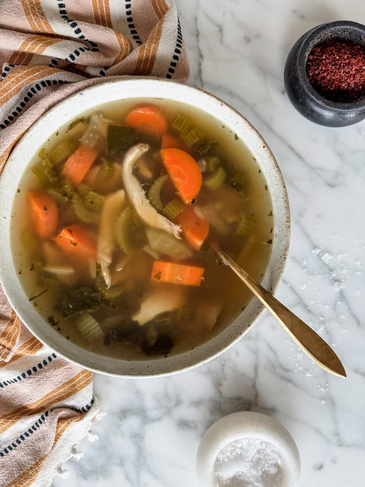 A great chicken soup starts with a great stock. It really does make all the difference. Once a week, I roast a chicken and make stock from the bones, so I always have stock in the refrigerator or freezer. But you can also easily use a purchased rotisserie chicken from the grocery store. I have a recipe for chicken stock in Room at the Table. The hands-on time is only minutes, and then it just needs to simmer for hours. The longer it simmers, the more flavor (and nutrients and collagen) the broth will have.