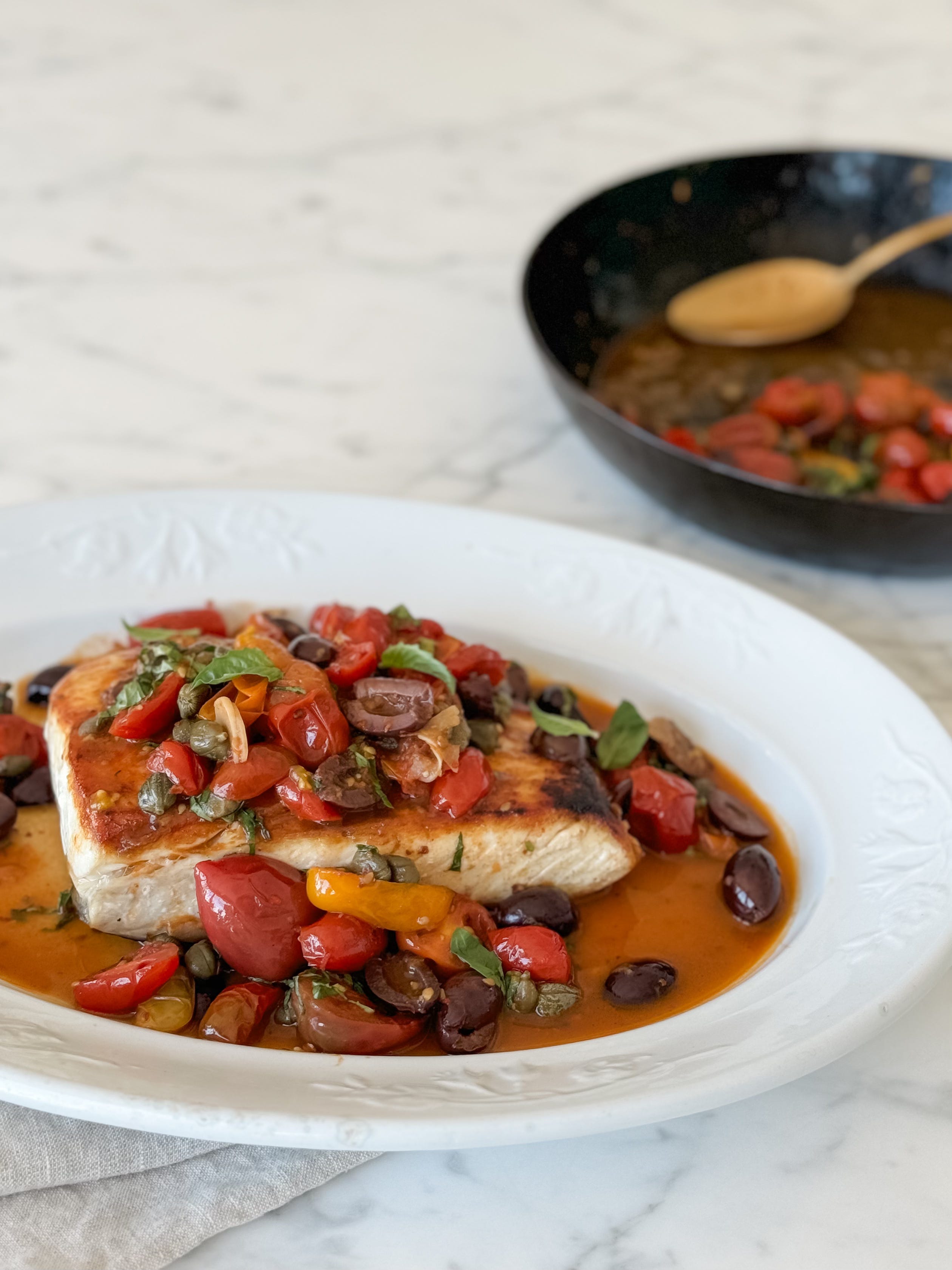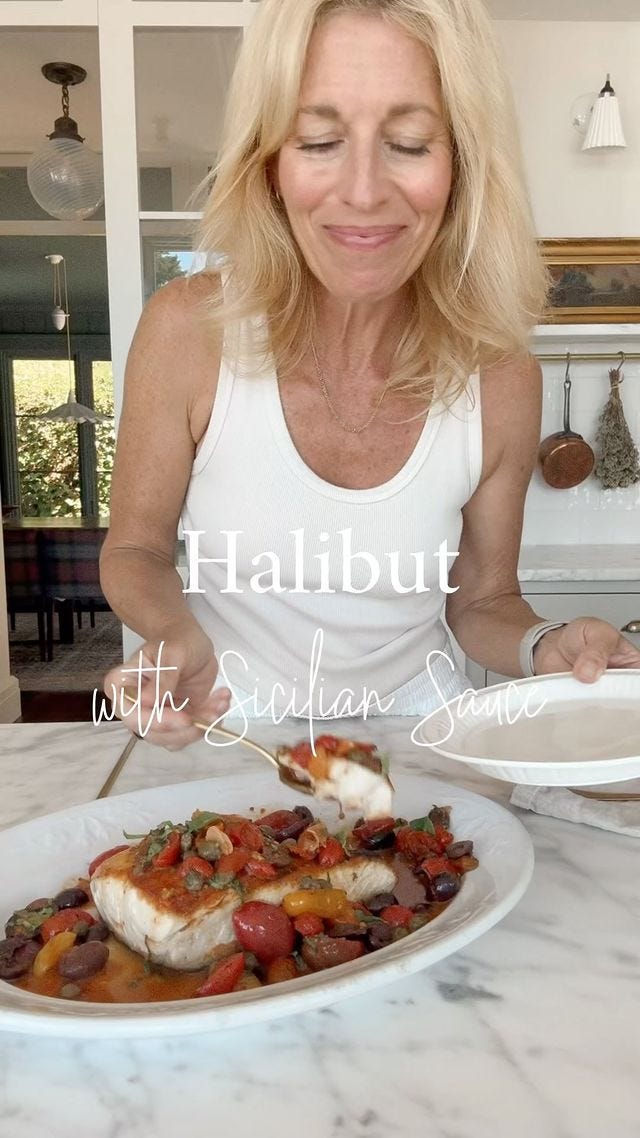 As promised, I’m back this week with a recipe for Seared Halibut with Sicilian Sauce. When we were in Sicily this summer, every restaurant served a Mediterranean white fish with their version of this sauce, essentially ripe tomatoes stewed with olives and capers. It feels like the essence of Italy, summer sunshine in a dish.