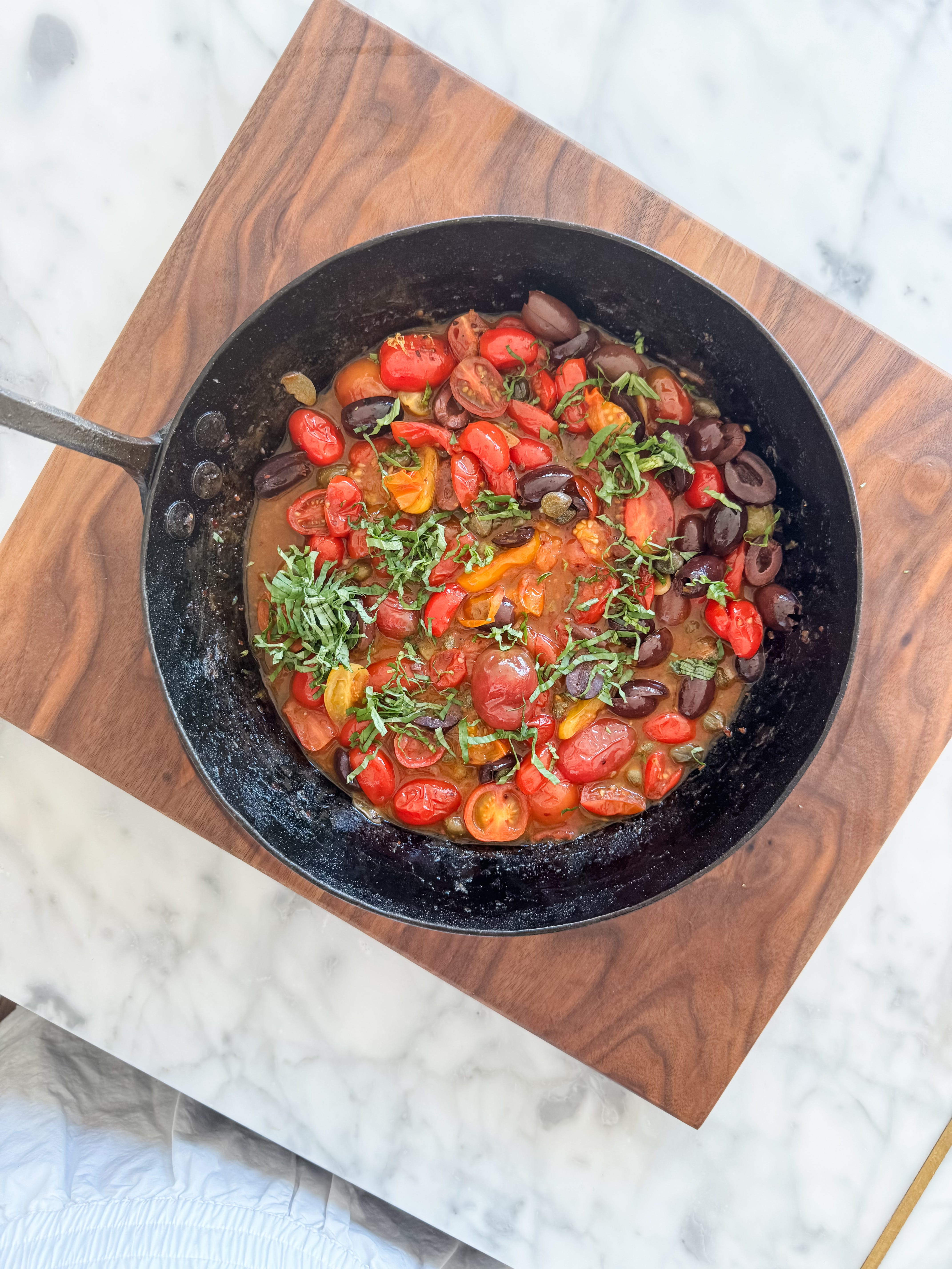 If you have a garden (or a local farmers market), this is the perfect recipe for those delicious late-season tomatoes. The sauce comes together in the amount of time it takes to cook the halibut, making it a quick dinner. You might think that you don’t like anchovies, but give them a try. It won’t taste fishy, I promise. The anchovies dissolve quickly in the oil, giving the sauce a salty, umami flavor. I love the Fishwife brand. If you can’t find salted capers in your grocery store, you can order these or something similar. The salted capers have a firmer texture and more subtle flavor than brined capers. Be sure to rinse them well to remove all the salt. But you can also use brined capers in a pinch. The flavor will be a little brighter. You might notice that there’s no salt in this dish. That’s because there are so many salty ingredients—anchovies, olives and capers—that you probably won’t need salt. But you can taste it at the end and at a little if you think it needs it. To me, this sauce is the essence of the end-of-summer. Enjoy it with a good glass of rose and an 8 pm sunset.
